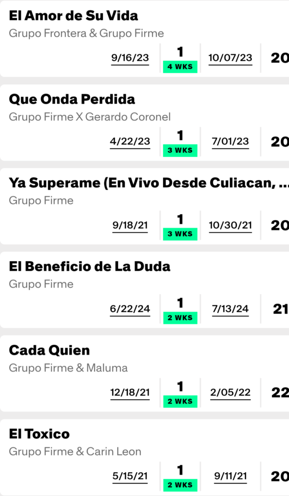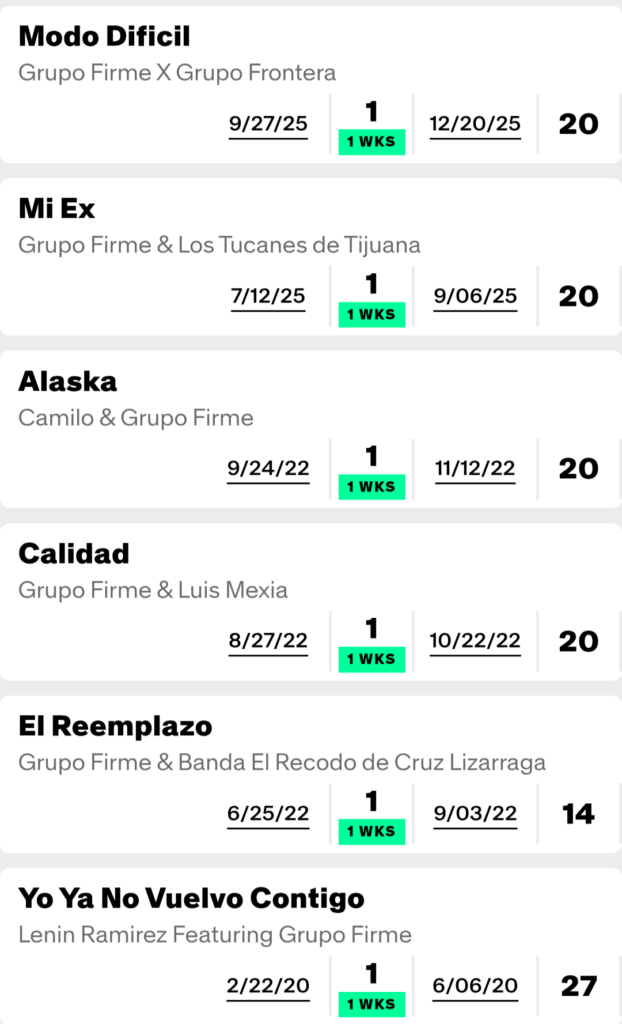 Grupo Firme has had 31 hits on Billboard’s Regional Mexican Airplay chart, of which 20 have reached the top ten and 12 have reached number one.
